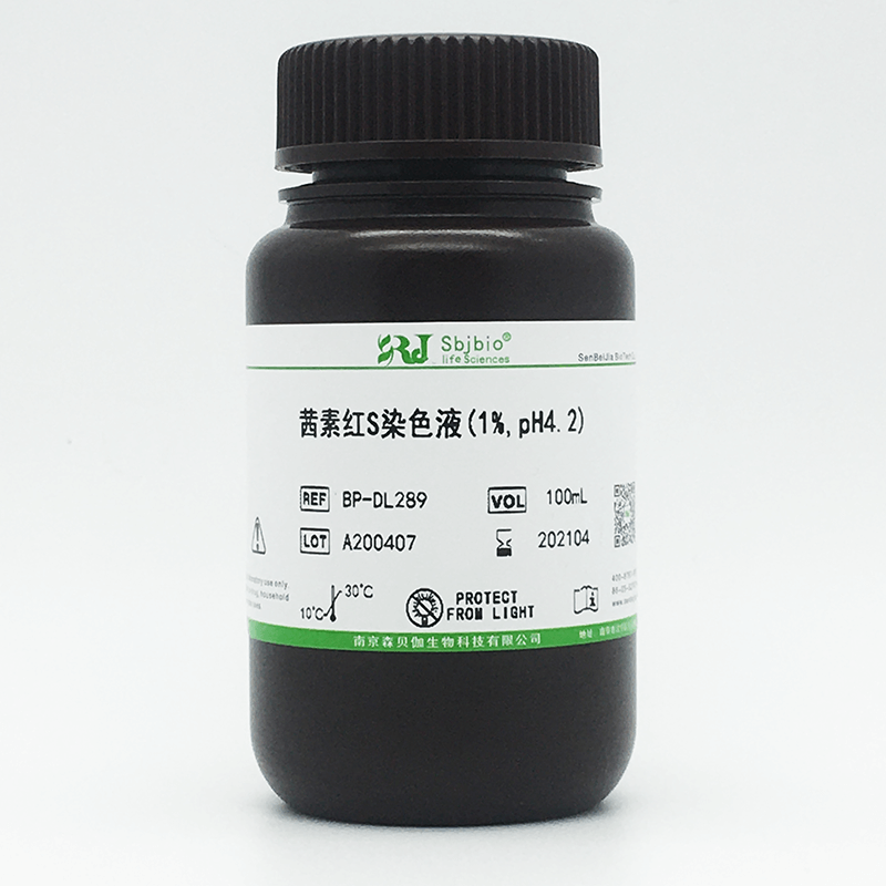 茜素红S属一种蒽醌类衍生物,是茜素磺酸钠盐,它能与碳酸钙或磷酸钙中的钙盐螯合形成橙红色复合物。茜素红S往往对少量的沉积物染色可得到更可靠的结果。常与固绿或Mayer苏木素染色液合用,结合形成橘红色沉淀,适用于少量钙盐组织的染色。该试剂仅用于科研领域,不用于临床诊断或治疗。